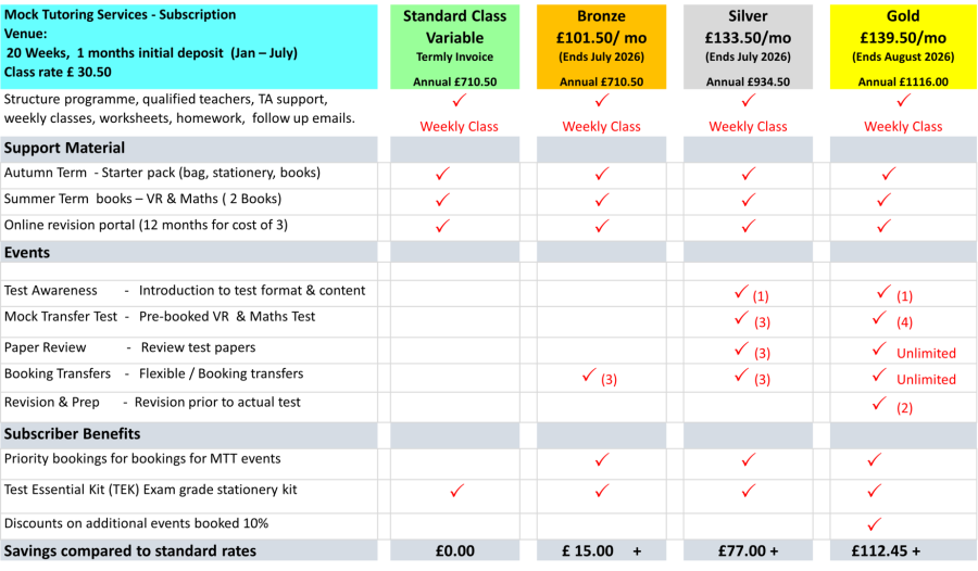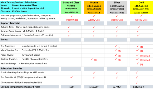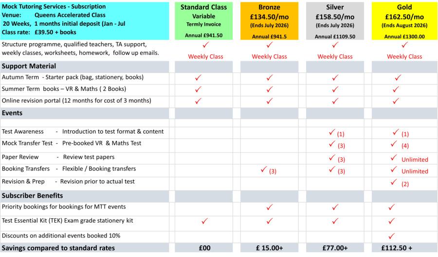 Included classes, books 4 mock tests, unlimited paper reviews, 1 test
